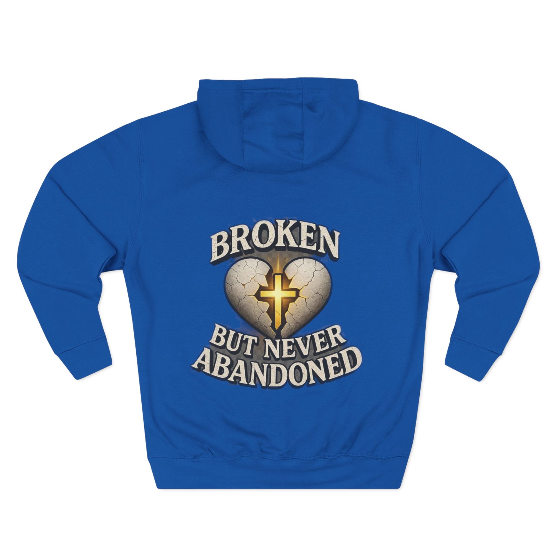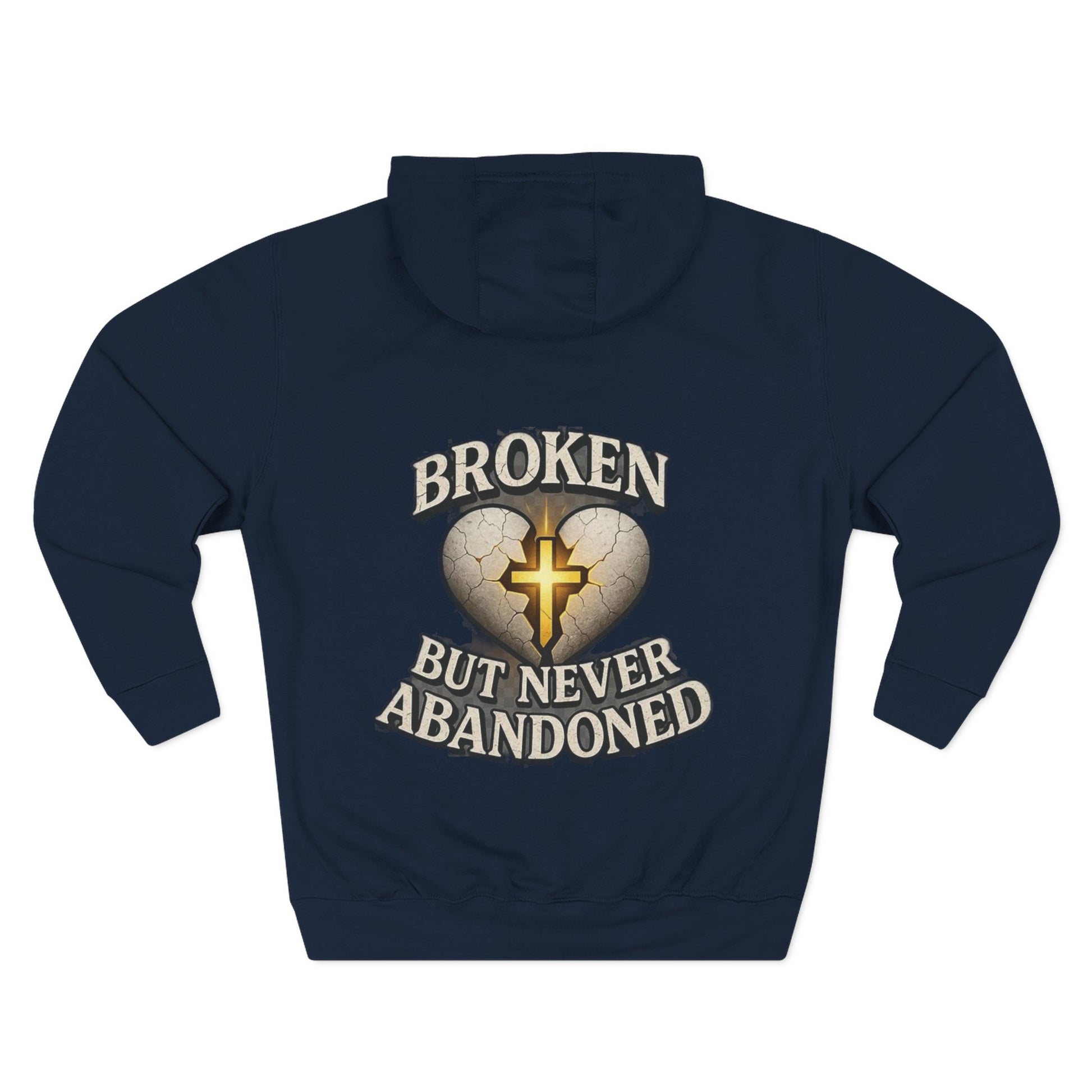 Embrace comfort and style with this three-panel fleece hoodie, designed for those who appreciate both warmth and meaningful expression. The soft hand-feel fabric envelops you in cozy luxury, making it perfect for lounging at home or heading out on casual adventures. The spacious kangaroo pocket is ideal for keeping your hands warm or storing small essentials. Perfect for anyone who values quality attire, this hoodie is an ideal gift for friends and family during holidays and celebrations, such as Christmas, birthdays, or as a comforting gesture for someone going through a tough time. Wear it with pride as a reminder of resilience, 'Broken But Never Abandoned.'