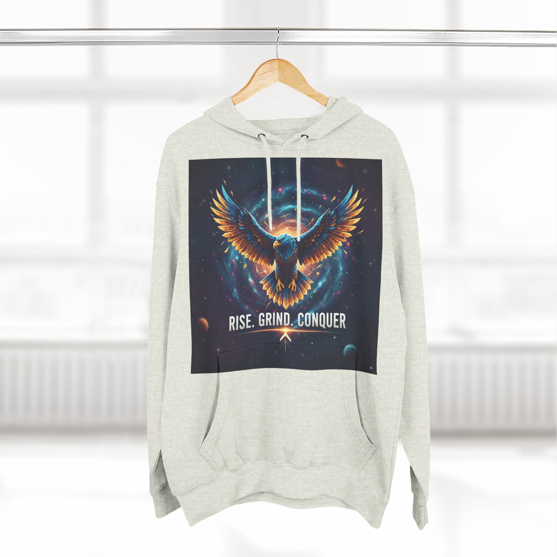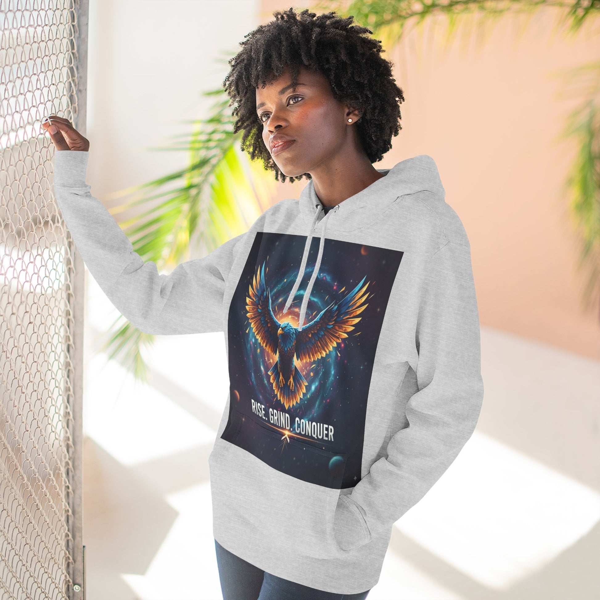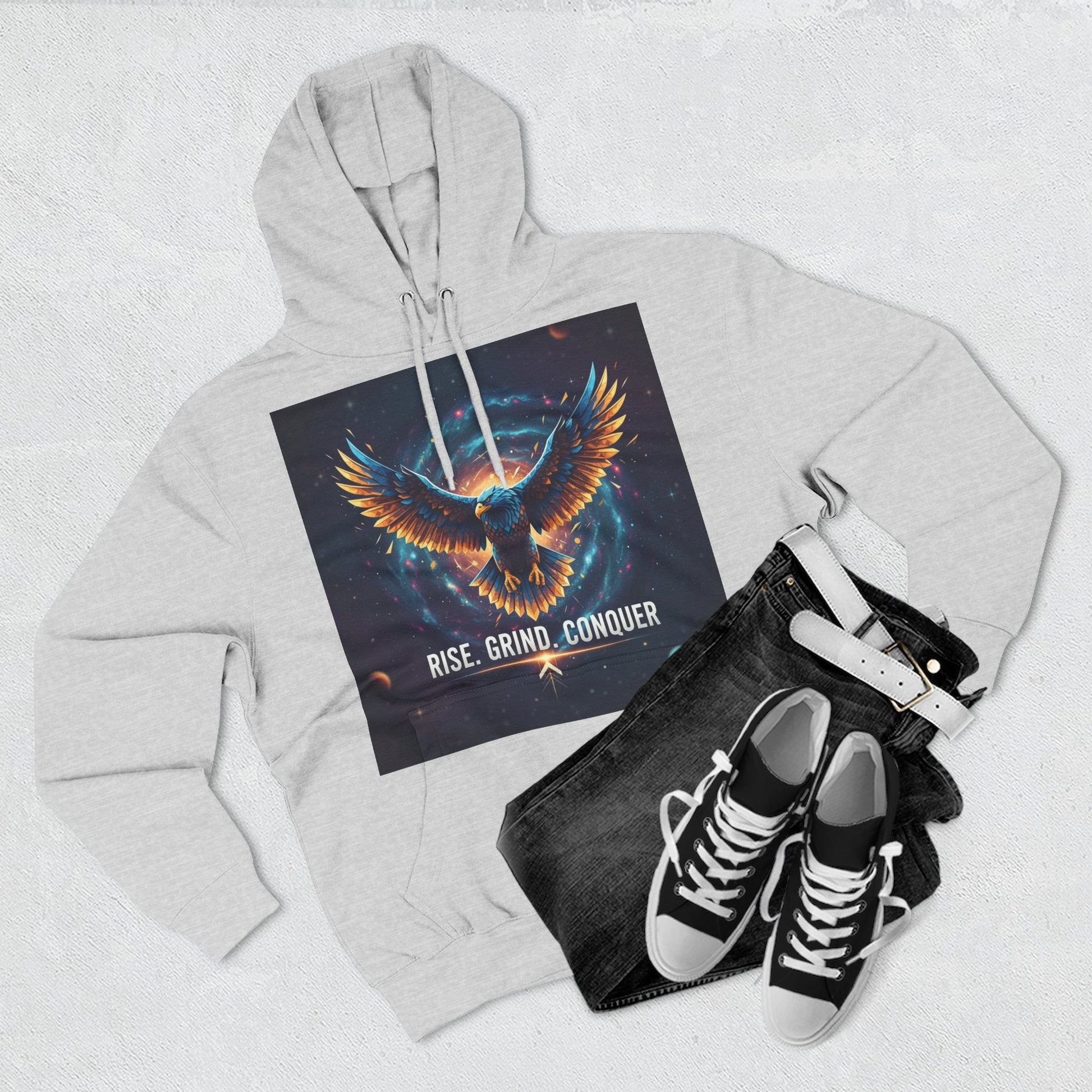 Motivational Fleece Hoodie, Rise Grind Conquer Sweatshirt, Gift for Gym Lovers, Inspirational Casual Wear, Cozy Fitness Apparel