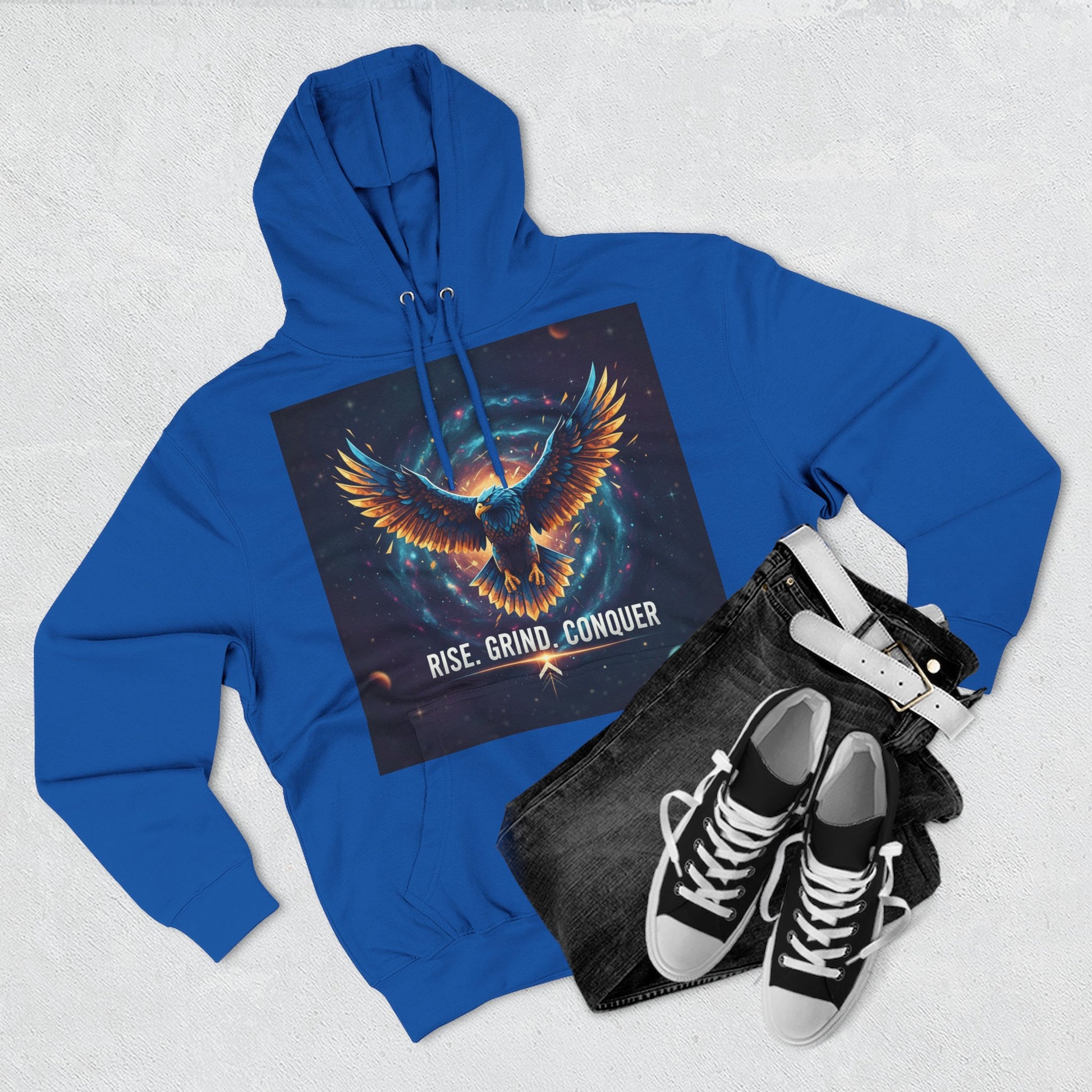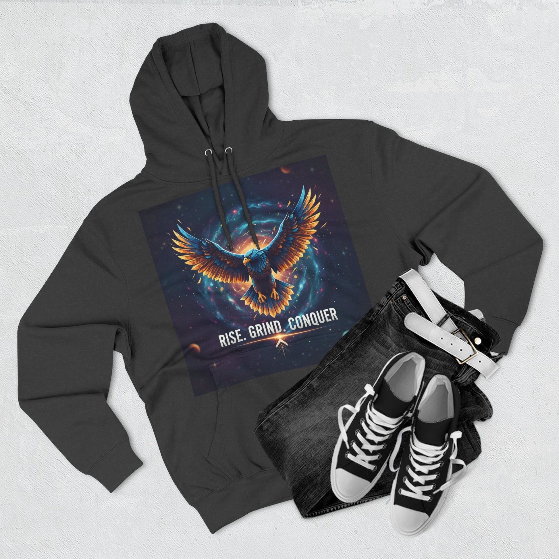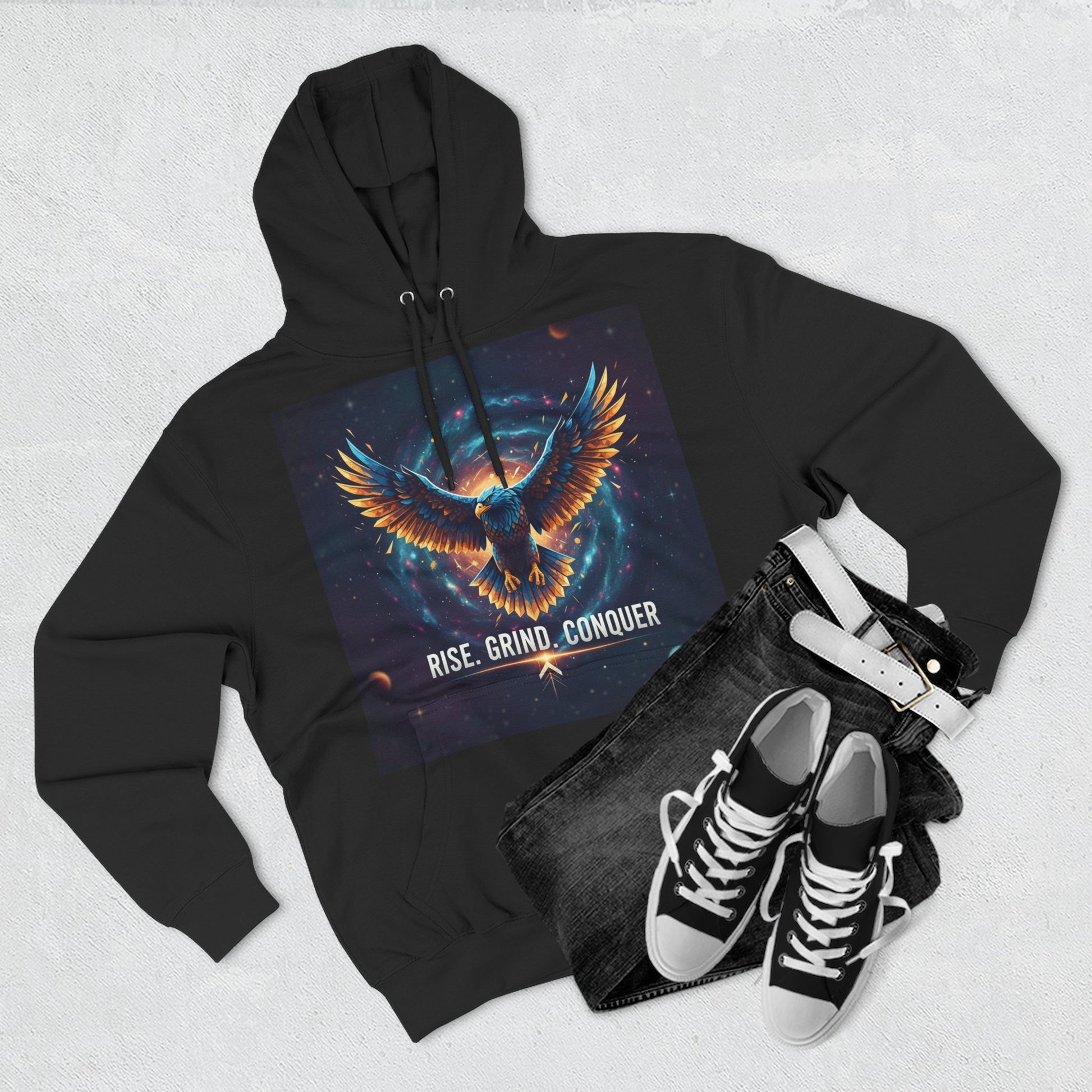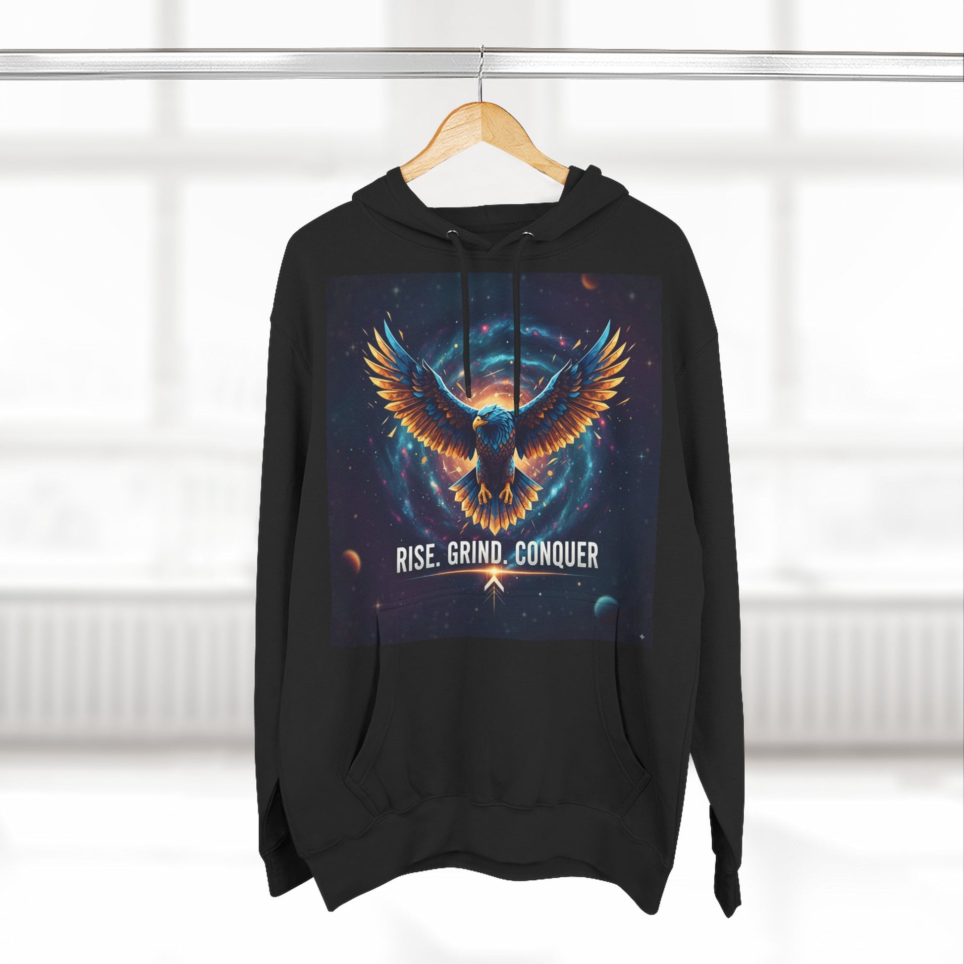 Motivational Fleece Hoodie, Rise Grind Conquer Sweatshirt, Gift for Gym Lovers, Inspirational Casual Wear, Cozy Fitness Apparel