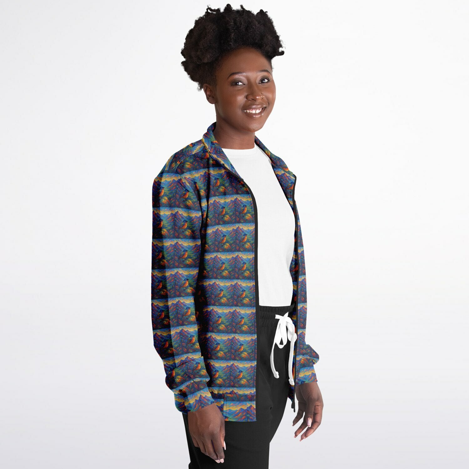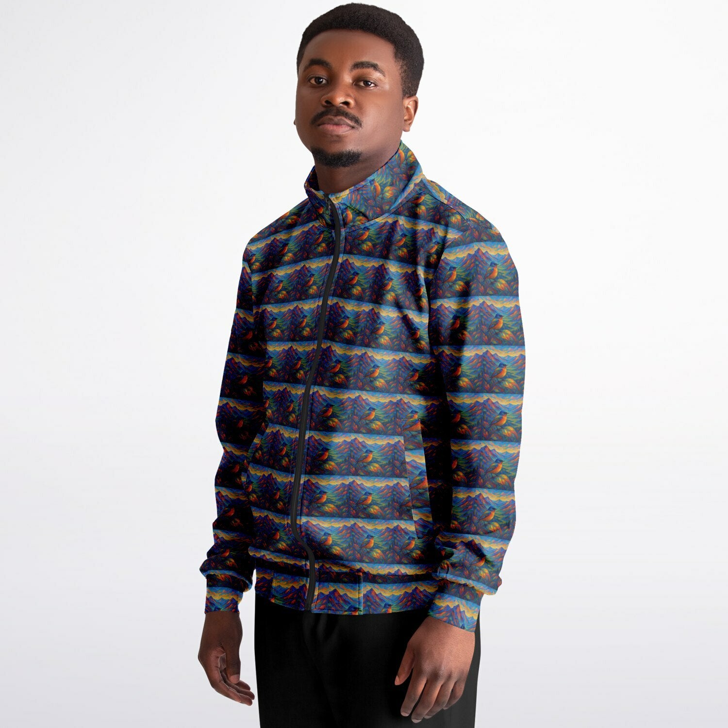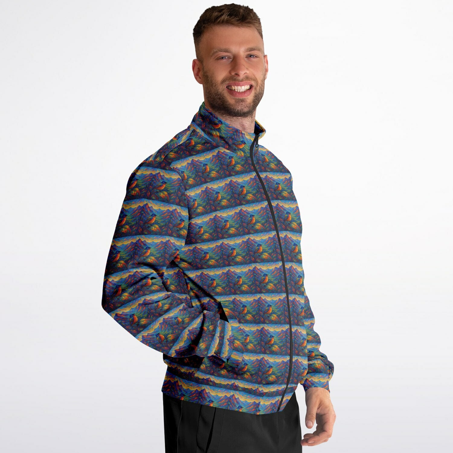 Presenting our sustainable track jacket, crafted from 95% recycled polyester and 5% spandex. With its smooth, tight-knit surface, it perfectly showcases vibrant prints and colors, while the inner surface ensures comfort for the wearer.